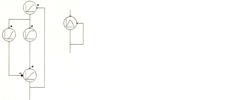 To illustrate the concept “network as dynamical system” more concretely, consider a small network with few elements with varying degrees of sigmoid nonlinearity (Figure 1). By appropriate adjustment of the thresholds and strengths of excitatory (+) and inhibitory (−) connections in network A, the whole network can be approximated with one element containing a single-hump function (B).