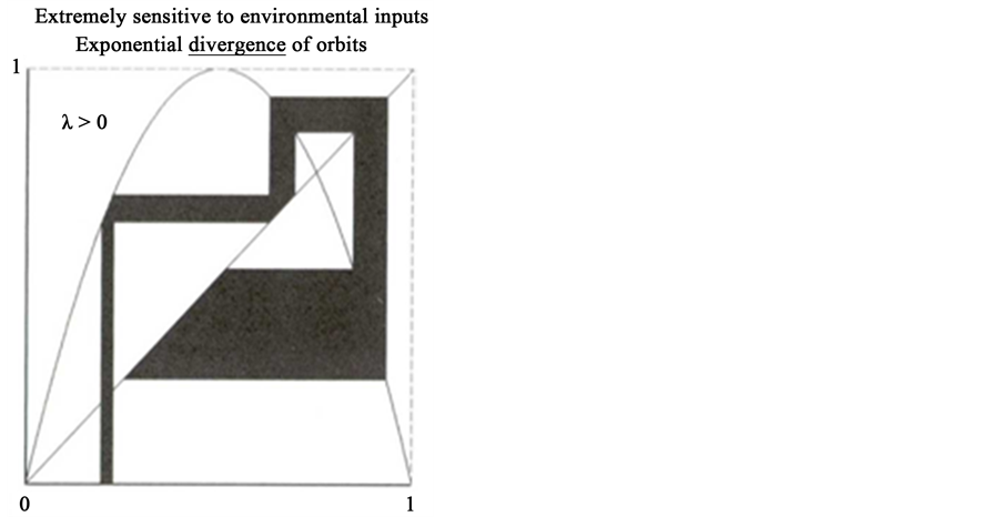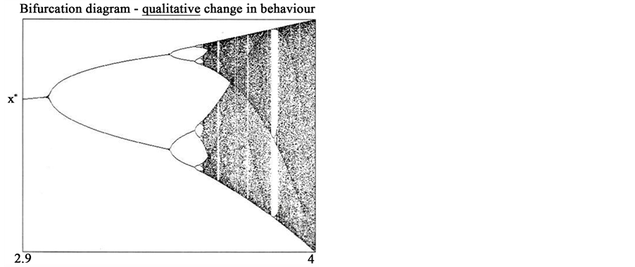 These qualitative changes in dynamical behaviors may be captured in a bifurcation diagram (Figure 2), which plots x at large times against the parameter a. As the parameter a is varied, an orderly progression develops from periods 1, 2, 4, 8, 16 … to infinite period, beyond which chaos sets in, intersperse with an infinite number of periodic windows as the parameter continues to vary. This is the well-known period doubling route to chaos [134] [135] .