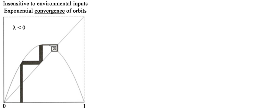 Figure 3. A quadratic map with exponential convergence of orbits with different initial conditions. Different environmental input values entering the network converges to the same periodic points or fixed point [135] .