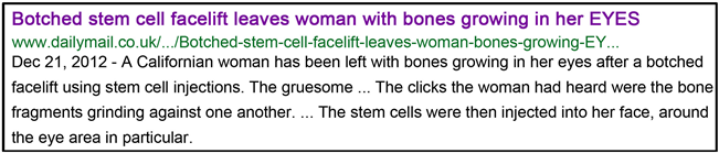 Figure 1. Internet headline of a complication from stem cell treatment to the face.