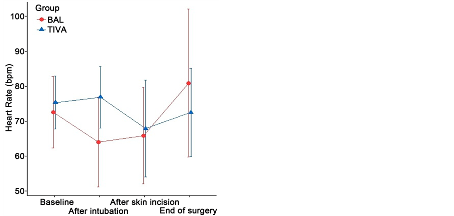 Figure 1. Hart Rate (bpm) for each group at specified perioperative periods. Points represent average and lines represent standard deviation of Hart Rate for each group at specified perioperative periods. Significant difference after intubation period between groups (p = 0.007; U of Mann-Whitney Test).