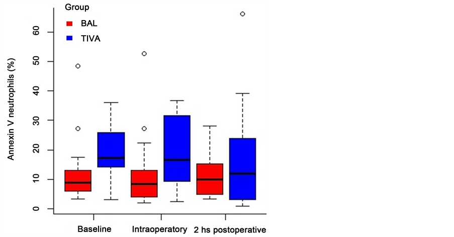 Figure 2. Distribution of Annexin values in neutrophils for each group at specified perioperative periods. Significant difference at baseline period between groups (p = 0.010; U of Mann-Whitney Test).Circles stand for outliers: observations that are more than 1.5 interquartile range above quartile 3.