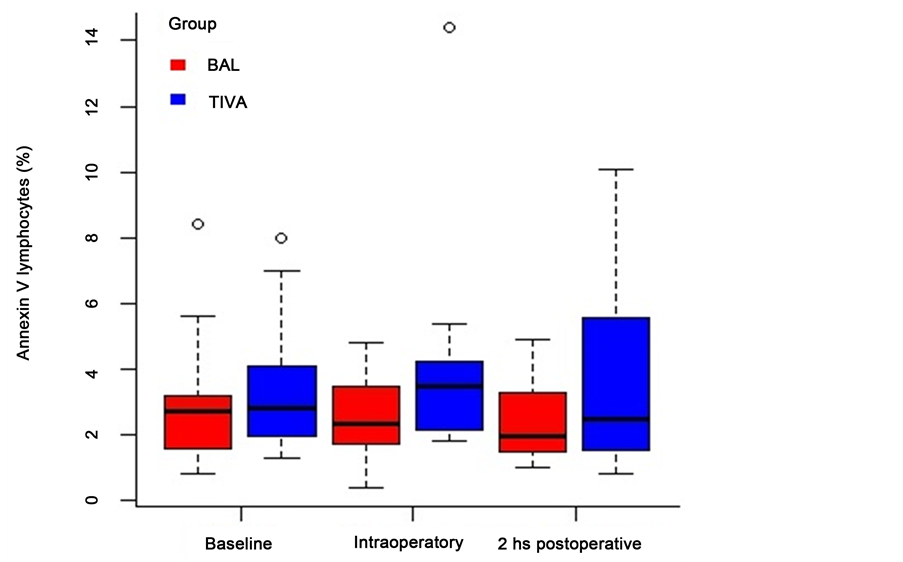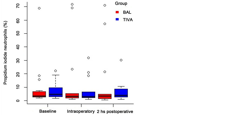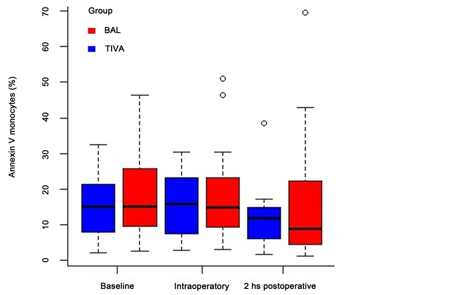With regard to markers of cell apoptosis, a significant difference was found in marker Annexin V in the baseline sample of neutrophils in the BAL Group (p = 0.010) compared with the TIVA Group (Figure 2). Neutrophils, monocytes and lymphocytes did not increase along with positive Annexin or PI during intra and post-surgical period, compared with baseline values in both groups (Figures 2-7).