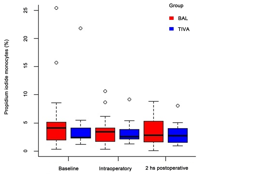 Figure 5. Distribution of Propidium Iodide values in monocytes for each group at specified perioperative periods. Circles stand for outliers: observations that are more than 1.5 interquartile range above quartile 3.