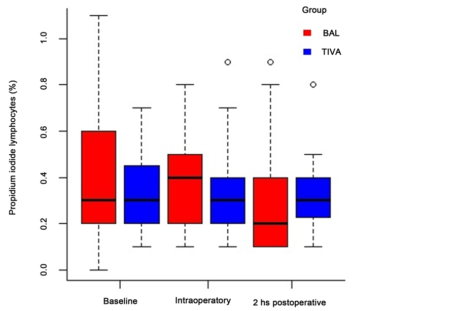 Figure 7. Distribution of Propidium Iodide values in lymphocytes for each group at specified perioperative periods. Circles stand for outliers: observations that are more than 1.5 interquartile range above quartile 3.