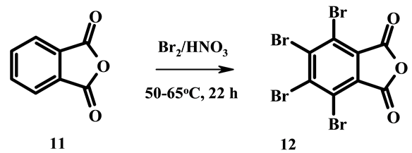 By means of the given method it is possible to introduce four atoms of bromine into molecule of phthalic anhydride. Interaction of phthalic anhydride 11 with bromine in concentrated nitric acid at 50˚C - 65˚C for 22 hours yields 79% of 3,4,5,6-tetrabromophthalic anhydride 12 (Scheme 4). In absence of bromine phthalic anhydride is nitrated to mixture of 3‑nitro and 4-nitro derivatives [13] . Proposed in literature methods for manufacture of tetrabromophthalic anhydride 12 used as flame retarder [14] consists in bromination of phthalic anhydride in strong oleum combined with sulfur dioxide oxidation process [15] [16] .