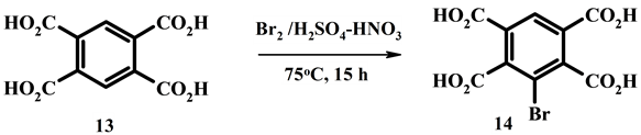 Accumulation of four carboxylic groups so deactivates benzene ring that prevents bromination in nitric acid. Pyromellitic acid 13 does not changed at interaction with bromine in concentrated HNO3. Bromination is possible to carry out with system Br2/H2SO4-HNO3. Pyromellitic acid 13 turns into 3-bromopyromellitic 14 under stirring in concentrated H2SO4 containing bromine and HNO3 at 75˚C for 15 hours in yield 90% (Scheme 5). Acid 14 was synthesized