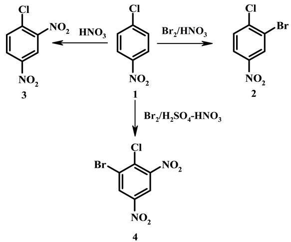 4-Chloronitobezene 1 was chosen as a substrate to characterize new brominating system Br2/HNO3 and to compare with system Br2/H2SO4-HNO3. Treatment of 4‑chloronitobezene 1 with bromine in concentrated nitric acid at room temperature during 4 h leads to 3-bromo-4-chloro-1-nitrobenzene 2 in yield 94%. In the same conditions but in absence of bromine 4-chloro-1,3-dinitrobenzene 3 is formed from 4‑chloronitobezene 1 almost quantitatively (Scheme 1). Bromination does not take place in 60% nitric acid.