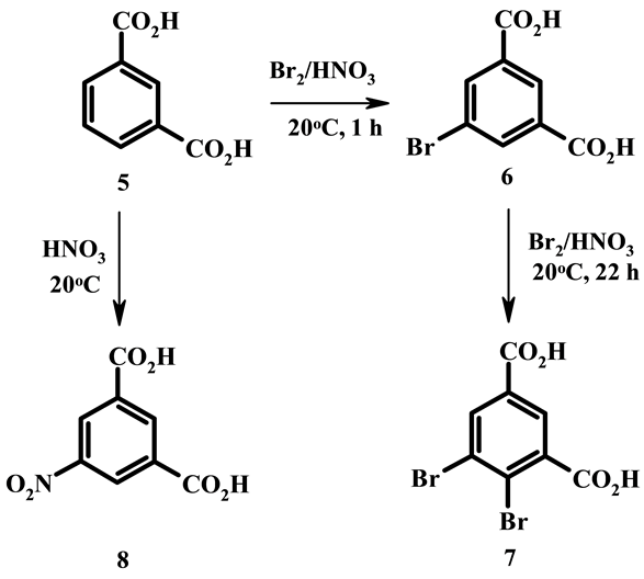 Preparative possibilities of bromination in concentrated nitric acid are demonstrated on an example of benzene dicarboxylic acids. Isophtalic acid 5 turns to 5-bromoisophthalic acid 6 in mild conditions. Compound 6 was isolated after stirring 5 in concentrated nitric acid containing excess of bromine at 20˚C for 1 hours in yield 55%. After 22 hours 4,5-dibromoisophthalic acid 7 was obtained in yield 65%. Treatment of isophthalic acid 5 with concentrated nitric acid at 20˚C in absence of bromine gives 5-nitroisophthalic acid 8 in high yield (Scheme 2). Isophtalic acid 5 is comparable with 4‑chloronitobezene 1 on easiness of bromination and suppression of nitration.