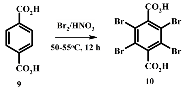 Long heating of isophthalic acid 5 with bromine in concentrated HNO3 at 55˚C - 60˚C does not lead to introduction into the ring more than two bromine atoms. Terephthalic acid 9 unlike acid 5 is completely brominated in concentrated HNO3. Heating of terephthalic acid 9 with bromine in concentrated HNO3 at 50˚C - 55˚C for 12 hours gives tetrabromoterephthalic acid 10 in yield 65% (Scheme 3). Earlier this compound was synthesized by bromination of terephthalic acid in 20 % oleum at presence of iodine at 125˚C during 76 hours [12] .