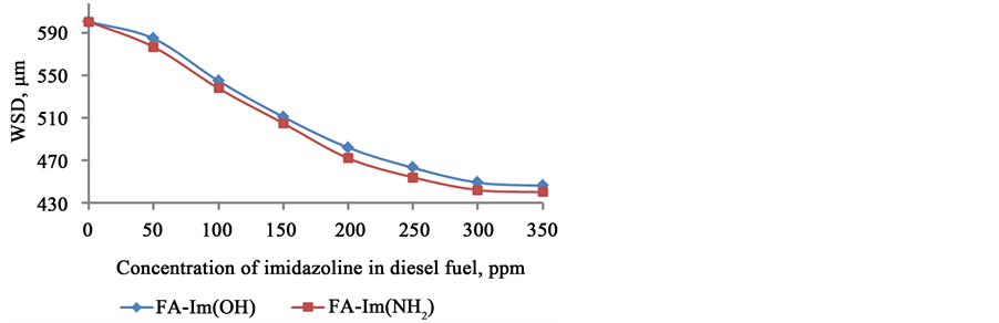 In order to study the influence of FA-Im(OH)- and FA-Im(NH2) imidazolines on lubricity quality of D-I and D-II low sulfur diesel fuels the WSD for D-I and D-II diesel fuels was determined after adding imidazolines to diesel fuels at 50 - 300 ppm. The WSD for each concentration was measured three times and eventually the average value of WSD was taken.