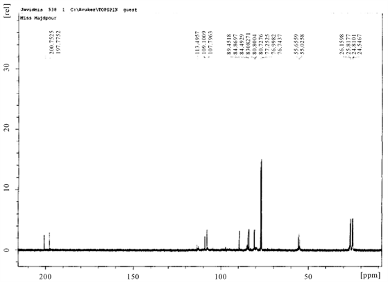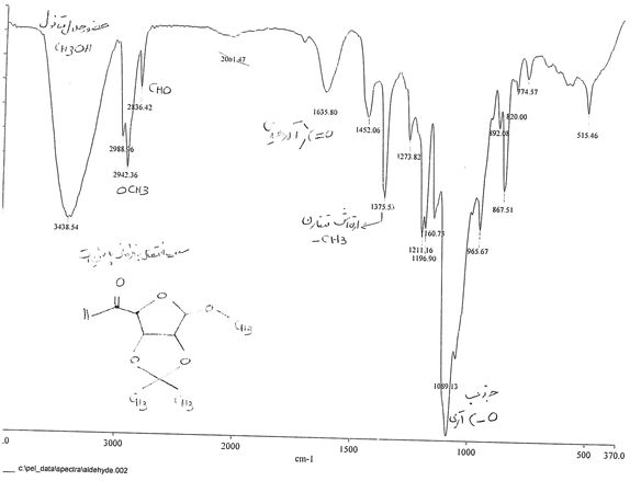 H-NMR (300 MHz, CDCl3): δ = 9.5 (s, 1H), 5.1 (s, 1H), 5.08(d, 1H), 4.63(d, 1H), 4.38 (d, 1H), 3.36(s, OCH3, 3H), 1.44(s, CH3, 3H), 1.30 (s, CH3, 3H) as shown in Figure A4; C-NMR (500 MHz, CDCl3): 200.7, 109.1, 89.4, 84.4, 80.7, 55.6, 25.8, 24.8 as shown in Figure A5; FTIR: 3448, 1638, 1088 cm−1.