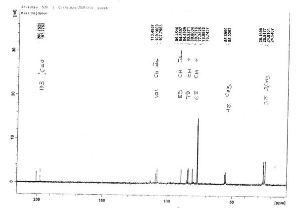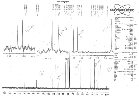 The C-NMR resonances showed 21 carbon signals, which could be resolved by DEPT experiments into seven CH3 groups at 19.1 (C-2), 18.5 (C-6), 26.3 (C-2’), 25.8 (C-2’), 53.9 (C-OCH3) 14.29 and 14.22 (CH3 side group), two CH2 groups at 59.7 and 59.4 (CH2 side group ), five CH groups at 33.6 (C-4), 79.9 (C-4’), 81.8 (C-8’), 85.3 (C-7’) 106.6 (C-6’), and seven quaternary carbons at 99.8 (C-5), 100.9 (C-3 ), 112.4 (C-2), 144.1 (C-2), 144.3 (C-6),168.1 (CO),168.4 (CO) as two carbonyl functional groups as shown in Figure A8.