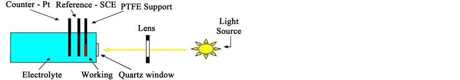 The electrochemical measurements were performed using a system similar to the one described by Shankar et al. [7] . Briefly, it is made of a pyrex cell with a 1.5 cm diameter quartz window, where the light, emitted by UV (Ultravitalux Osram) lamp placed at distances of 4.5 cm . The source has a spectrum with peak intensity in the UVA region at 360, 400 nm and the UV intensity, which is measured on the sample by a photo-Radiometer HD2302.0 (Delta OHM) over the spectral range 220 - 400 nm, is 24 W∙m−2. Along the optical path to the cell, a lens was interposed in order to collimate the radiation of the light source. The active surface of the sample (1 cm2) was immersed in a KOH 1 M solution and placed at 0.5 cm from the quartz window (Figure 2). Photo- currents and “open circuit potential” (OCP) measurements were made via a potentiostat 1287 (Solartron). The potentiodynamic were performed with a scan rate of 20 mV∙s−1 in the range of potential −1.23 ÷ 1.70 V vs. NHE in conditions of presence and absence of UV. The OCP measures were recorded in the presence and absence of UV. Impedance measurements were performed in the same cell by means of a generator of frequency response 1260 (Solartron) in the range of 65 kHz ÷ 1 Hz with a sinusoidal signal of amplitude 10 mV. In particular the charging layer capacity (CSC) of the interface electrode/electrolyte was measured at a frequency of 15 kHz, applying a scanning potential of 1 mV∙s−1 between −1 ÷ 2.25 V vs. NHE and with an alternating component of 10 mV in order to obtain the Mott-Schottky plot.