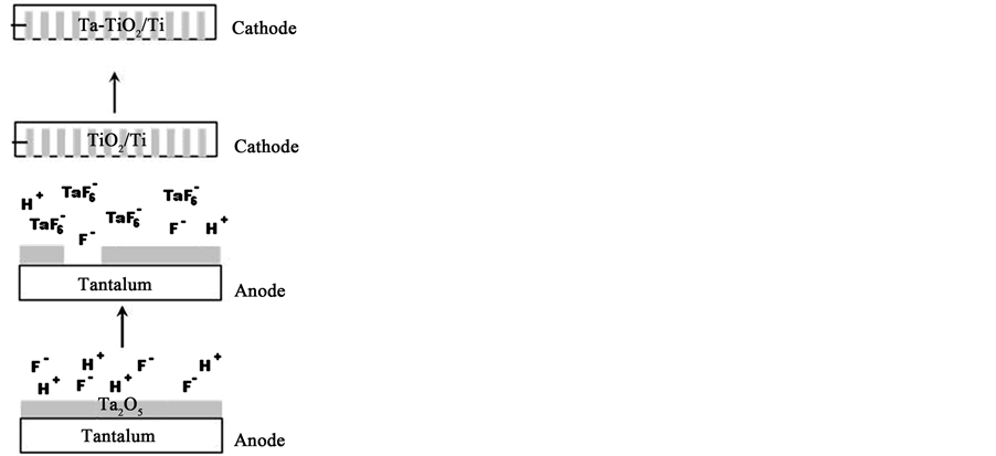 The doping of the TiO2/Ti specimen is based on the evidence that, in this experimental condition, the tantalum sheet undergoes an anodization (Equation (3)) and an etching process (Equation (4)) similar to that observed for the titanium with dissolution of specie [58] [59] :