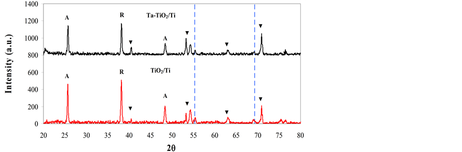The XRD pattern of nanotube TiO2/Ti, obtained through electrosynthesis route, is depicted in Figure 4. From comparison with the Ta-TiO2/Ti substrate pattern (black trace), no difference can be noted and all features typical of the titanium metal and TiO2 are observed. Particularly, a few peaks, ascribable to titanium oxide material anatase and rutilo can be recognized [62] [63] . The results indicate that Ta doping does not introduce changes in the TiO2 structure.