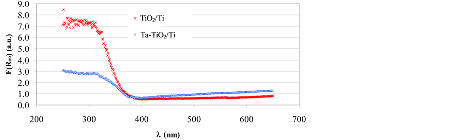 The diffuse absorbance spectra of the two samples, obtained by the Kubelka-Munk equation, are showed in Figure 5. Both the samples show the main absorbance in the UV range of 300 - 350 nm, but the TiO2/Ti sample owns a better behavior in this part of the spectrum. Instead, the Ta-TiO2/Ti specimen shows an increase in the low UV region, starting from a wavelength of 380 nm.