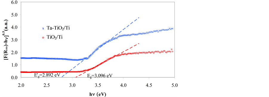 The diffuse reflectance spectrum of the TiO2 samples was obtained using a Lambda 9 spectrophotometer equip- ped with an integrating sphere. The reflectance data was converted to the absorption coefficient values according to the Kubelka-Munk equation [51] [52] :