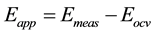 where Emeas is the electrode potential (versus NHE) of the working electrode, at which photocurrent was measured under illumination, Eocv is the electrode potential (versus NHE) of the same working electrode at open circuit conditions under the same illumination and in the same electrolyte.