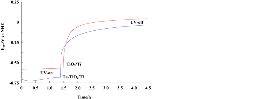 Figure 7 shows the open circuit potential (Eocv) for TiO2/Ti and Ta-TiO2/Ti with UV on and off. When applying the UV, Eocv decreases sharply and it reaches a steady state at a lower potential. After the switching off the light source, Eocv increases rapidly in the first seconds and then slowly until to a new steady state level. In UV on condition, the doped electrode shows an Eocv of −0.68 V vs NHE while the un-doped one −0.57 V. The decrease of photo-potential indicates a clear effect on the degree of band bending for the doped n-type metal oxide semiconductor.