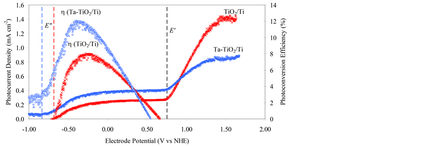 Figure 8 shows the curves of photo-current and photo-electrochemical performance of TiO2/Ti and Ta-TiO2/ Ti. The photo-conversion efficiency η, which is the light energy to chemical energy conversion efficiency, is calculated as [7] :