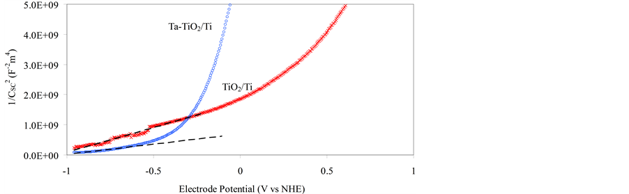 where k is the slope of (1/Csc)2 vs. electrode potential plot. Figure 10 shows the Mott-Schottky plot for TiO2/Ti and Ta-TiO2/Ti, evidencing a clear decrease of the k slope after the Ta doping with a calculated ND increase from 1.3 ´ 1027 m−3 to 2.4 ´ 1027 m−3.