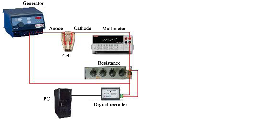 A small disk of commercially pure grade-3 titanium (Titania, Italy) has been used as substrate for the nanotube growth. The circular sample had a diameter of 15 mm with a thickness of 0.5 mm , and was arranged to show an active circular area of 1 cm2. The un-modified sample (TiO2/Ti) was prepared with the methodology previously developed in different articles [8] [50] . Briefly, after 3 min. pickling in a HF (Carlo Erba)/HNO3 (Carlo Erba) solution made by a volumetric ratio of 1:3 and diluted in deionised water until to 100 ml, the titanium disks have been set in a three-electrode cell containing a 1 M KOH solution (Carlo Erba) and subjected to a prefixed and optimized density current (1 mA∙cm−2) generated by a potentiostat/galvanostat (Solartron 1286) for 3 min. The counter-electrode was a platinum sheet, while the reference was a standard calomel electrode (SCE). The anodic growth of the nanotube arrays has been obtained in a two-electrode cell with a platinum counter electrode, using a glycol ethylene (Ashland) solution with 1 %wt. H2O and 0.2 %wt. NH4F and applying 60 V for 3 h by means of a potenziostat/galvanostat PS251-2 (Aldrich). The current has been measured with a Keithley 2000 multimeter and been acquired with a Madge-Tech Volt101 digital recorder placed in series with a calibrated resistance (300 Ω) Leeds and Northrup (Figure 1).