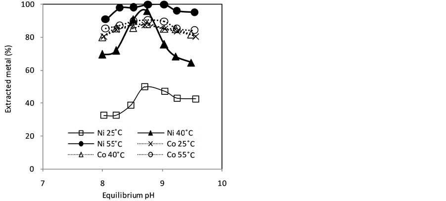 Single stage extractions of nickel and cobalt from ammonia-ammonium carbonate solution using 40% (v/v) LIX 84-ICNS and O/A 1/1 were carried out at temperatures 25˚C, 40˚C and 55˚C and various equilibrium pH. Profiles of nickel and cobalt extractions as a function of temperature and equilibrium pH are depicted in Figure 4. Theoretically, the increase of temperature tends to enhance equilibrium concentration of metal ions that can be extracted to organic phase. Moreover, at higher temperatures, the solubility of the organic phase in aqueous solution and the viscosity of organic solution is lower that leads to a better contact between the organic and the aqueous phases during mixing. The extraction is usually operated up to 80˚C - 85˚C. The operations at higher temperatures might cause degradation of the organic solution.