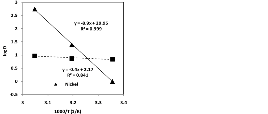 As can be seen in Figure 4, the increase of temperature increases both nickel and cobalt extractions. Hence, the increase of temperature enhances also distribution coefficients of nickel (DNi) and cobalt (DCo). Profiles of logD versus (1/T) for nickel and cobalt at equilibrium pH of 8.75 are illustrated in Figure 5. Linier regression lines of logD versus (1/T) for nickel and cobalt have a slope of −8.93 and −0.40, respectively which indicates that temperature give more significant influence to nickel extraction than to cobalt. The effect of temperature on equilibrium constant and the change of enthalpy (DH) of the extraction reaction follow a prominent Van’t Hoff Equation: