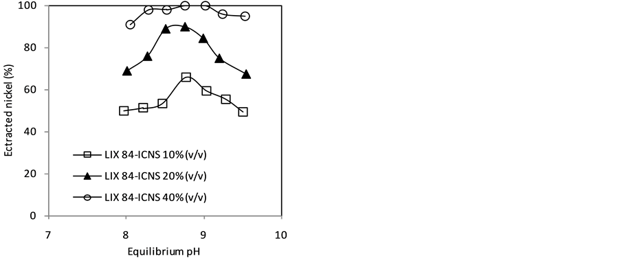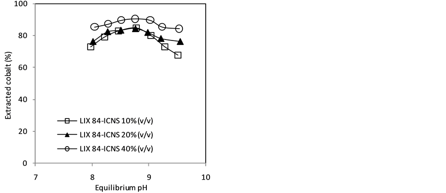 In practice, less amount of extractant used is attempted to have more competitive process in financial point of view. The investigation results show that nickel and cobalt extractions are only 65.6% and 84.7%, respectively, when the concentration of LIX 84-ICNS is 10% (v/v) at equilibrium pH of 8.75, 55˚C and O/A ratio of 1/1. In order to determine suitable extractant concentration for achieving higher nickel extraction, the extractant concentration was varied at 10%, 20% and 40% (v/v). Profiles of nickel and cobalt extraction as a function of equilibrium pH at various extractant concentrations are presented in Figure 6 and Figure 7, respectively. As expected, the extractions of nickel and cobalt increase by the increased of extractant concentration. The higher metals extraction at higher extractant concentrations is in-line with Equation (1) and (3), in which the increase of extractant concentration would shift the equilibrium reaction to the right-side that leads to the enhanced of metal extraction.