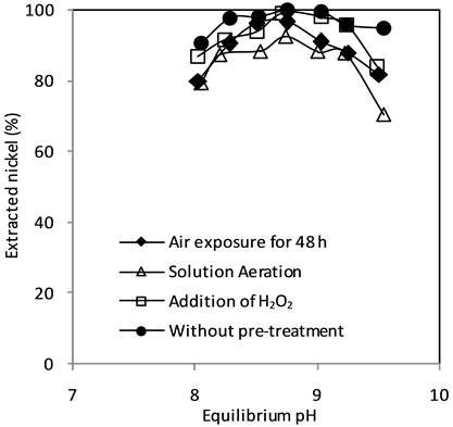 Figure 8. Effects of various pre-treatments of aqueous solutions on nickel extraction at 55˚C, 40% (v/v) LIX 84-ICNS and O/A ratio 1/1.