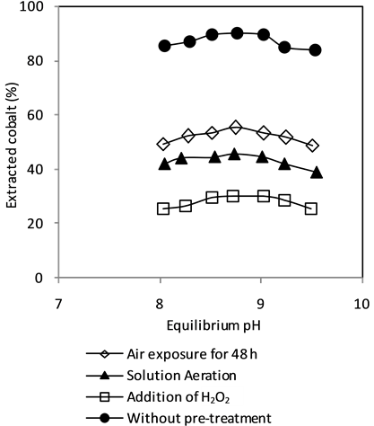 As can be seen in Figure 8, pre-oxidation processes conducted prior to extraction does not notably influence nickel extraction. In contrast, cobalt extraction is significantly affected by pre-oxidation method of the aqueous