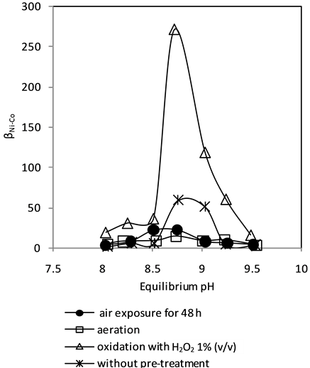 Figure 10. Separation factor of Ni-Co (bNi-Co) as a function of equilibrium pH and pre-treatment methods of aqueous solution prior to extraction.
