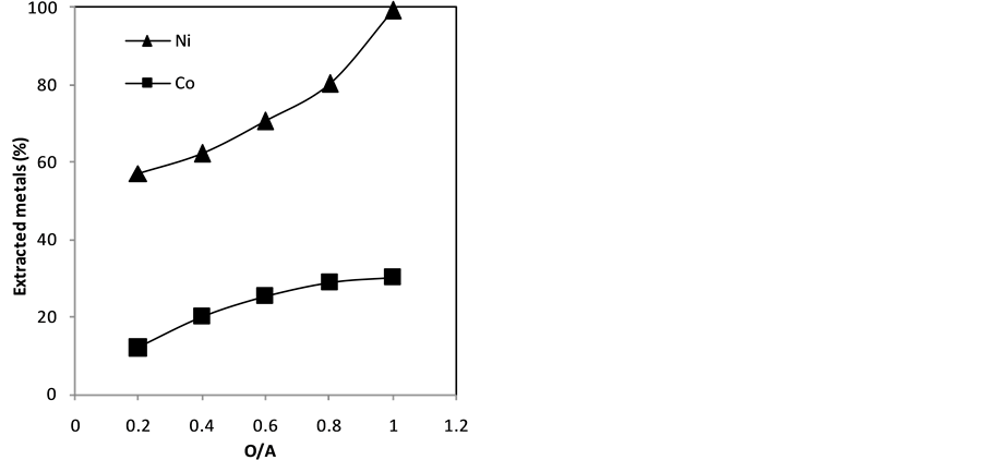 Figure 11. Influence of O/A ratio on nickel and cobalt extractions.