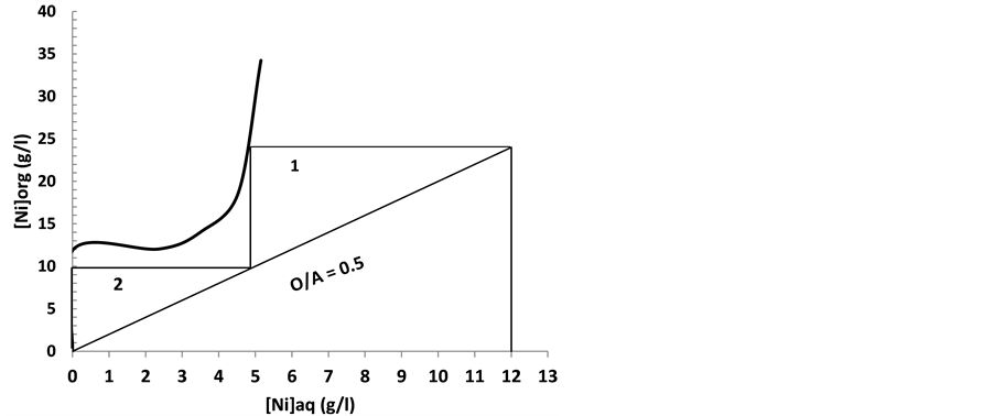 Figure 12. McCabe-Thiele Diagram constructed for nickel extraction at pH 8.75, temperature of 55˚C and LIX 84-ICNS of 40% (v/v).