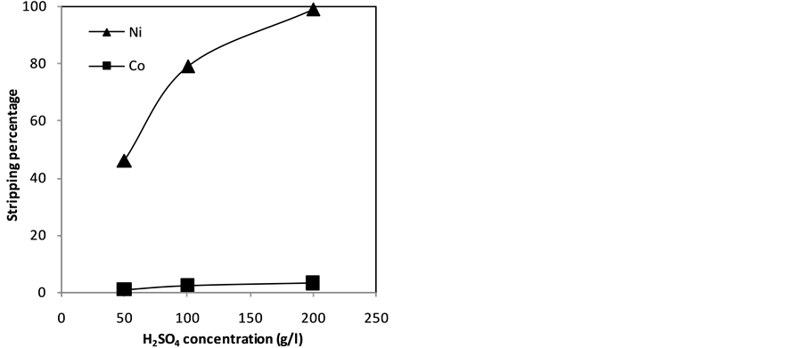 Figure 13. Profiles of nickel and cobalt stripping percentage as a function of H2SO4 concentration at temperature of 80˚C and O/A ratio 1/1.