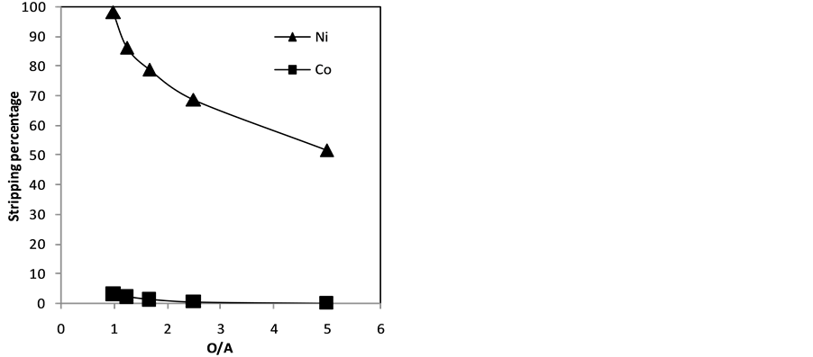 Figure 14. Profiles of nickel and cobalt stripping percentages as a function O/A ratio at H2SO4 concentration of 200 g/l and temperature of 80˚C.
