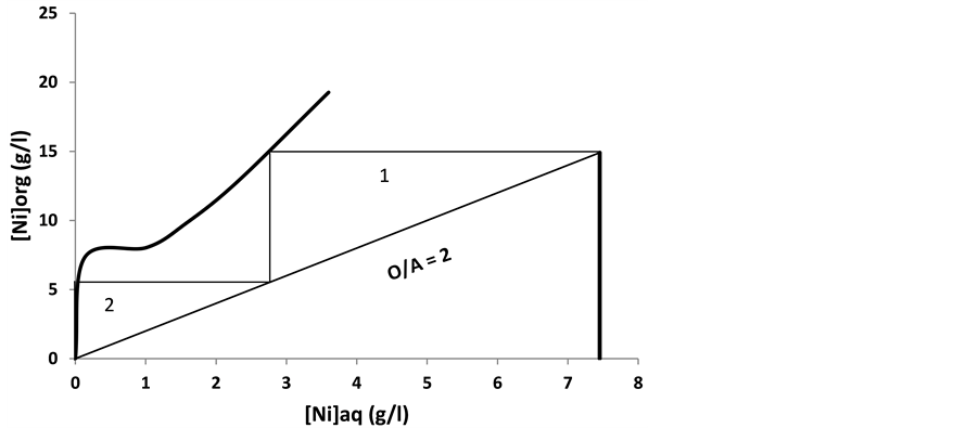 Extraction isotherm diagram for nickel was constructed based on the data obtained from the extraction testworks at equilibrium pH of 8.75, temperature 55˚C, extractant concentration of 40% (v/v), O/A ratios of 0.2, 0.4, 0.6, 0.8 and 1.0. An optimum O/A ratio must be determined in which high metal extraction at low O/A ratio is