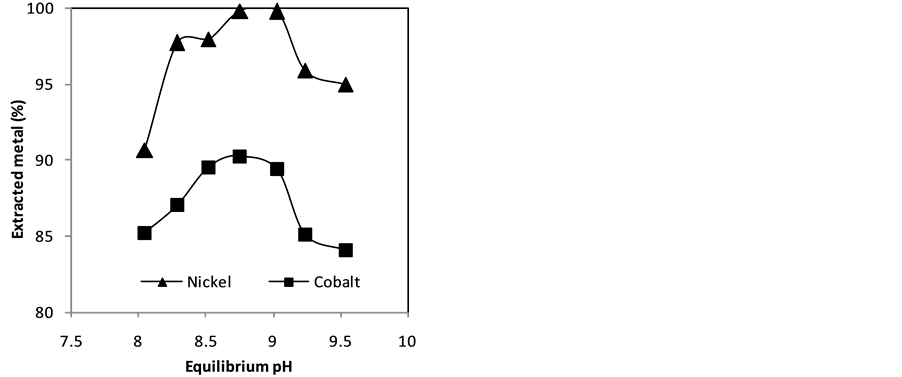 phase. The alteration of ammonia concentration by addition of NH3 for pH adjustment gives higher impact to nickel than that to cobalt. Nickel ammonia complexes are reported to be more stable than those of cobalt [7] . Nickel can form various Ni-ammine complexes such as di-ammine, tetra-ammine and hexa-ammine. The type of Ni-ammine complex is dependent on the solution pH. Following Hu, at pH 8.5, nickel forms a complex of nickel tetra-ammine [7] . The formation of nickel tetra-ammine is the reason for the decreased of Ni extraction obtained at equilibrium pH above 8.75. Decreasing metal extractions during SX in ammoniacal solutions beyond pH 8.4 were reported by Nathsarma and Sarma [16] beyond pH 8.5 by Hu, et al. [7] and beyond pH 9 by Alguacil and Cobo [17] . According to Hu, et al., at pH 8.5, the predominant species is nickel tetra-ammine complex and the average coordination number of ammonia per mole of nickel ion is approximately 4, therefore, the decrease of nickel extraction is mainly attributed to the formation of nickel ammine species with ammonia ligands of more than 4 which is more stable in aqueous solution [7] .