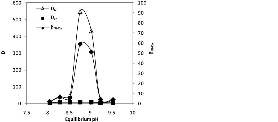 The pH of aqueous solution was adjusted to values ranging between 8.0 and 9.50 using sulphuric acid or ammonia solution. Single stage extraction was carried out at 55˚C, O/A ratio 1/1 and 40% (v/v) LIX 84-ICNS. Profiles of extracted Ni and Co as a function of equilibrium pH are presented in Figure 2. The experimental results show that the extraction percentages of nickel and cobalt rises by the increased of equilibrium pH values. Maximum extracted nickel and cobalt of 99.8% and 90.3% were obtained at equilibrium pH 8.75, respectively. At this pH level, DNi, DCo and bNi-Co are 548.3, 9.3 and 58.9, respectively. Profiles of DNi, DCo and bNi-Co as a function of equilibrium pH at 55˚C, O/A ratio 1/1 and 40% (v/v) LIX 84-ICNS are depicted in Figure 3. Extraction of nickel by LIX 84-ICNS performs through the following reaction: