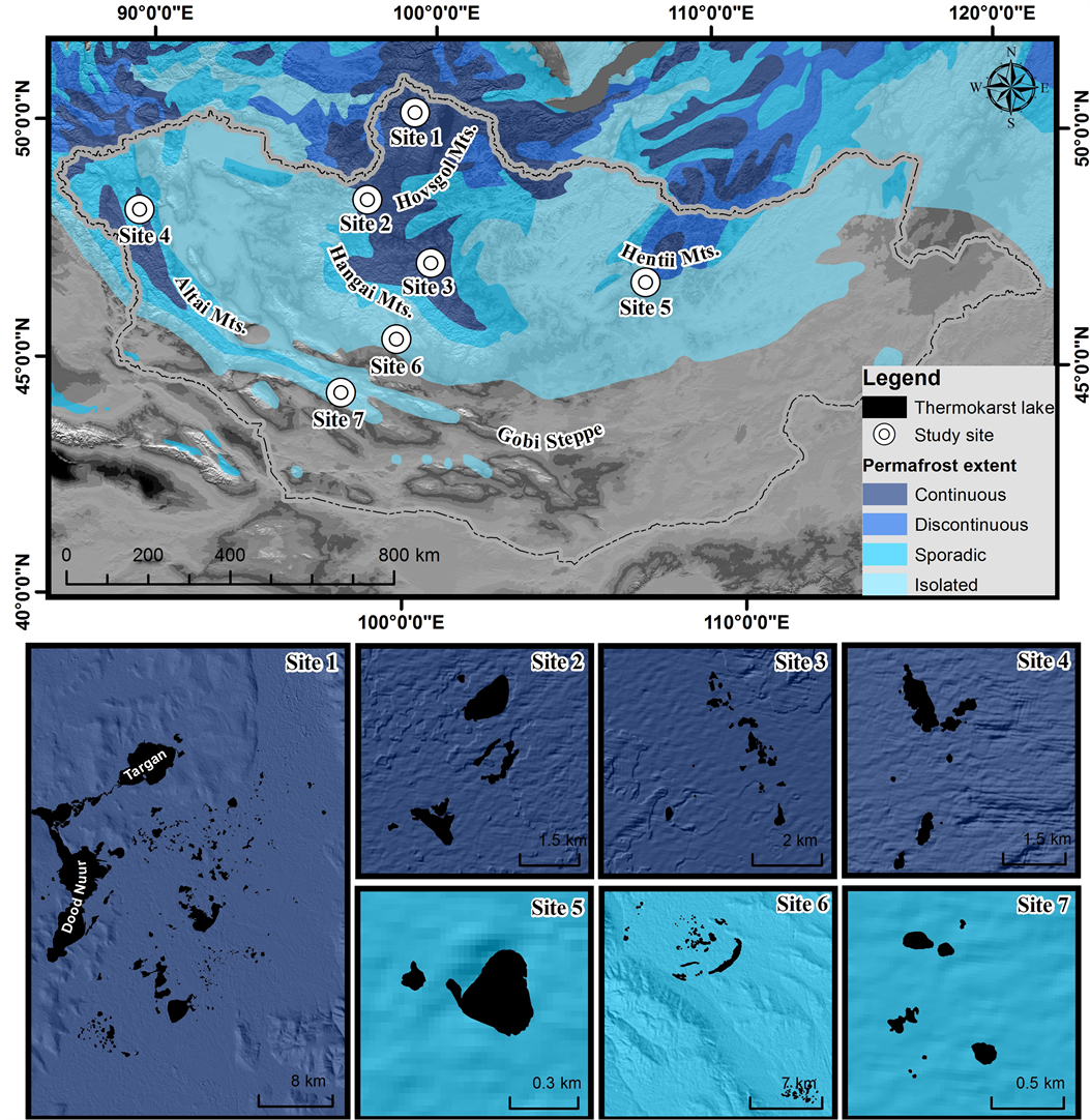 The primary objective of this study is to provide quantitative information on the temporal and spatial changes of thermokarst lakes in Mongolia using a time series of high-resolution satellite imagery. The other objective is to address the effects of the long-term trends of hydro-climatic regimes and permafrost degradation on the areal changes of lakes.