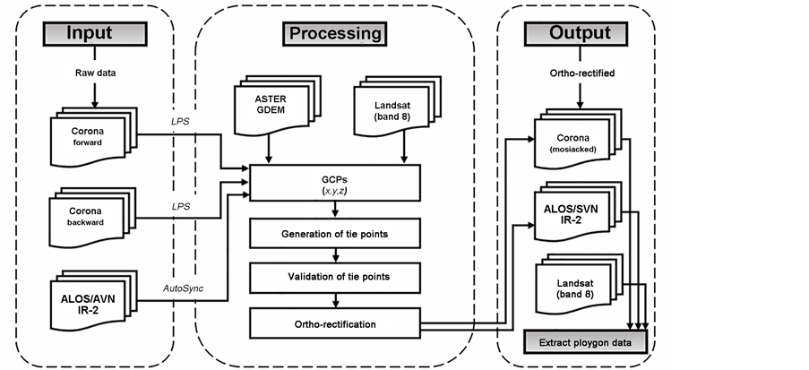 The Corona strips are known to contain significant geometric distortions, especially at the edges of an image along the track [24] [25] . To geometrically correct and orthorectify the strips, we used a non-metric camera model in ERDAS Leica Photogrammetric Suite (LPS) version 9.3 software, where we assigned the focal length, the pixel size of the scanned scenes and flight altitude of the camera platform [26] . We used the bundle block adjustment procedure in LPS to simultaneously estimate the orientation of all Corona strips based on ~100 ground control points (GCPs). Latitude (x) and longitude (y) information of the GCPs were extracted from the panchromatic Landsat ETM+ images (band 8), whereas elevation information (z) was extracted from the ASTER Global Digital Elevation Model (GDEM). All tie points were automatically placed at the correct locations on both images (forward and backward) in LPS. The Corona stripes were mosaicked in LPS to produce the final orthorectified images. Root mean square error (RMSE) of the aerial triangulation for Corona images were less than 15 m because of the small subset of data used at study sites.