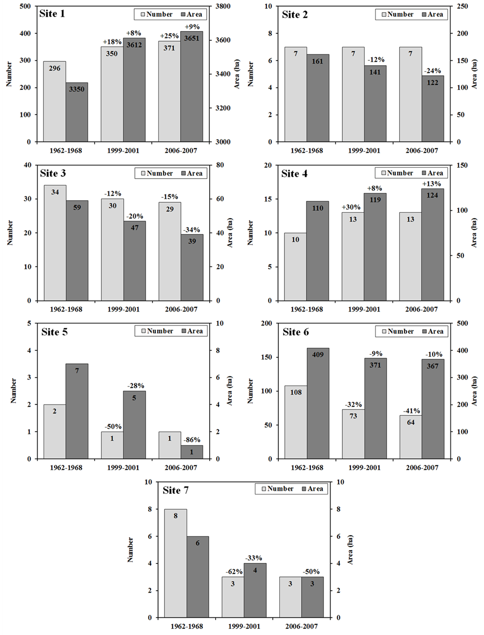 Contrasting changes in thermokarst lake dynamics were observed between the continuous and isolated permafrost zones in Mongolia. For the continuous permafrost zone (sites 1-4), the total number of lakes increased by 73 (or +21%), from 347 in 1962/68 to 420 in 2006/07 (Table 3). The total lake area shows similar pattern as the lake number, increasing the total area of lakes over the study period (1962/68 to 2006/07) from 3680 ha to 3936 ha (or +7%). In site 1, the number of lakes increased by +25% (from 296 to 371), and their area increased from 3350 ha to 3651 ha (or +9%) between 1962 and 2007 (Figure 3). The number of lakes in site 2 remained stable throughout the whole study period. However, area of lakes decreased by −24% (161 ha to 122 ha) from 1962 to 2007. Both number and area of lakes in site 3 showed a decrease of −15% (34 to 29 in number) and −34% (59 ha to 39 ha) respectively during the study period. In site 4, ten lakes were delineated in 1962/68, then their number increased by 3 (or +30%) in 1999/01 and later remained stable for 2006/07. Lake area in this site increased by +13% from 1962 to 2007.