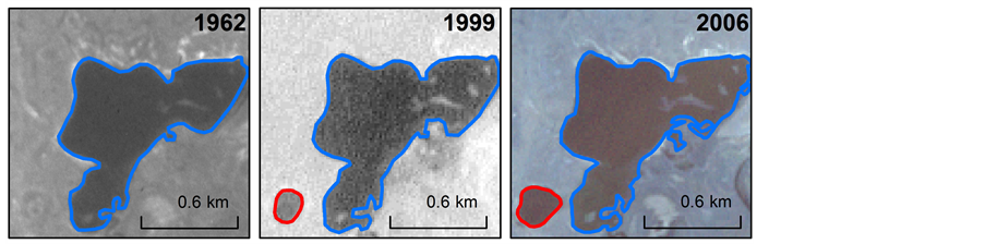 of the satellite imagery for years 1962, 1999 and 2006. The new lakes appeared mostly in sizes less than 10 ha, while maximum size found was 113 ha. Such results consist of the local permafrost conditions (Table 1; e.g., ice-rich permafrost and shallow active layers [17] ). Decrease in sites 2 and 3 is a result of large lakes become fragmented following partial drainage. These results demonstrate the importance of analyzing both lake number and area to provide a meaningful information for understanding thermokarst lake dynamics.