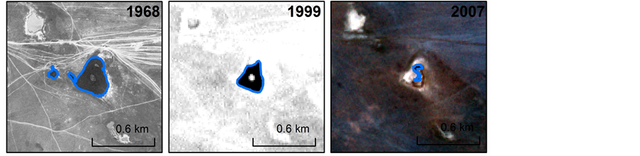 We visually delineated all lake areas from each satellite image that were above a minimum area of 0.1 ha (1000 m2). The shoreline of each lake was manually traced as a polygon area using ArcGIS 9.1 software. The areas of the extracted lake polygons were computed (Figure 2). Finally, we categorized the extracted lake areas into four distinct classes (i.e., 0.1 - 1 ha, 1 - 10 ha, 10 - 100 ha, and 100 - 1000 ha) in order to better un-
