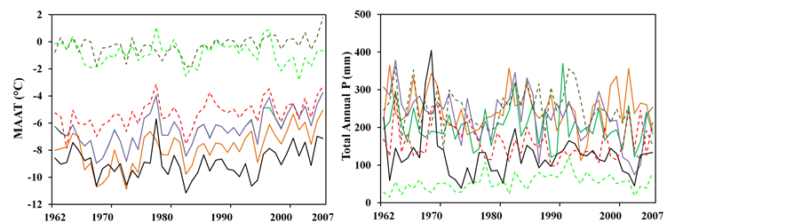 Figure 5. Hydro-climatic change from 1962 to 2007: (a) Mean annual air temperature MAAT; (b) total annual precipitation P; (c) total annual potential evapotranspiration PET; and (d) water balance P-PET at all study sites. Solid lines show the sites 1 - 4 in the continuous permafrost zone while dashed lines show the sites 5 - 7 in the isolated permafrost zone.