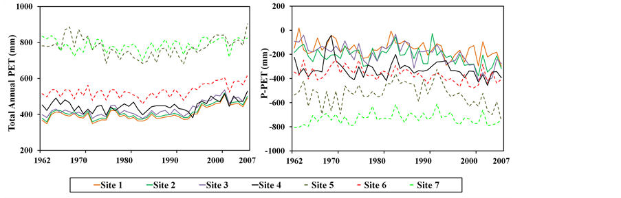 continuous permafrost zone between 1962 and 2007 (Figure 5(a)). In the isolated permafrost zone, MAAT increased slightly at the sites 5, 6, and 7 (0.91˚C, 1.62˚C, and 0.35˚C, respectively) during the last 45 years. Total annual precipitation (P) decreased at all sites (Figure 5(b)), except site 7 (Table 6). The correlations of the linear trend at those sites were insignificant since the 1962. However, the total annual potential evapotranspiration (PET) increased significantly at all sites mainly due to increasing MAAT, except for sites 5 and 7. The total annual PET had higher amounts at sites 5-7 in the