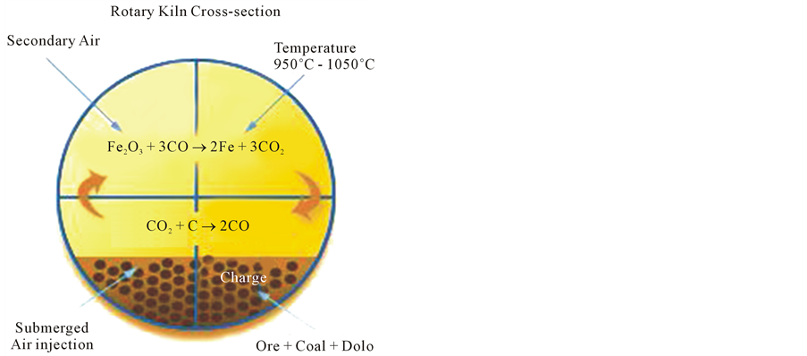 Most of the plants in India use DRI process—a solid state direct reduction process by which iron ore is reduced to sponge without phase change (Figure 1). Raw material mix-iron ore, dolomite and coal are fed to one end of rotary Kiln and product sponge iron along with char is taken out from the other end. Apart from this, primary and secondary airs are supplied to the Kiln to initiate the combustion and reaction processes. The reaction takes place at high temp (1050˚C to 1065˚C). Coal plays a dual role in the Kiln. Part of coal is used as fuel to supply the desired heat so as to take the raw materials to the desired temp. But main role of coal is to supply carbon in the reduction process. Dolomite is used as sulphur scavenger which finally comes out with the char. Char contains ash of coal and other impurities of iron ore. The reactions inside the kiln are given below [1] :