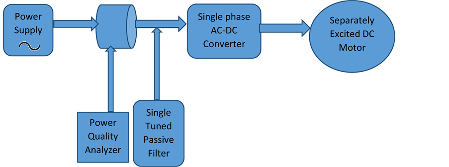 Figure 2 shows the experimental setup of rectifier based separately excited dc motor it can be seen from the Figure 2 that the input supply is AC. To convert this AC into DC AC-DC converter is used. Power quality analyzer is used to measure the harmonic distortion and the power factor before and after installation of filter. Single tuned passive filter is used to improve the power factor and reduce the THD caused by AC-DC converter according to IEEE standard 519-1992. Figure 3 shows the developed experimental model of the research work.