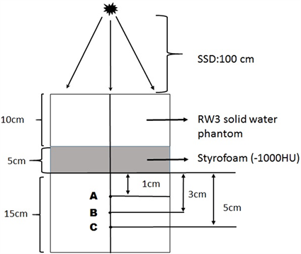 Figure 1. Experimental measurement assembly, SSD = 100 cm, 10 × 10 cm gap field, RW3 solid water phantom and 5 cm Styrofoam (−1000 HU). A measurement point: Point dose in a 1 cm area after tissue-air transition, B measurement point: Point dose in a 3 cm area after tissue-air transition, C measurement point: Point dose in a 5 cm area after tissue-air transition.